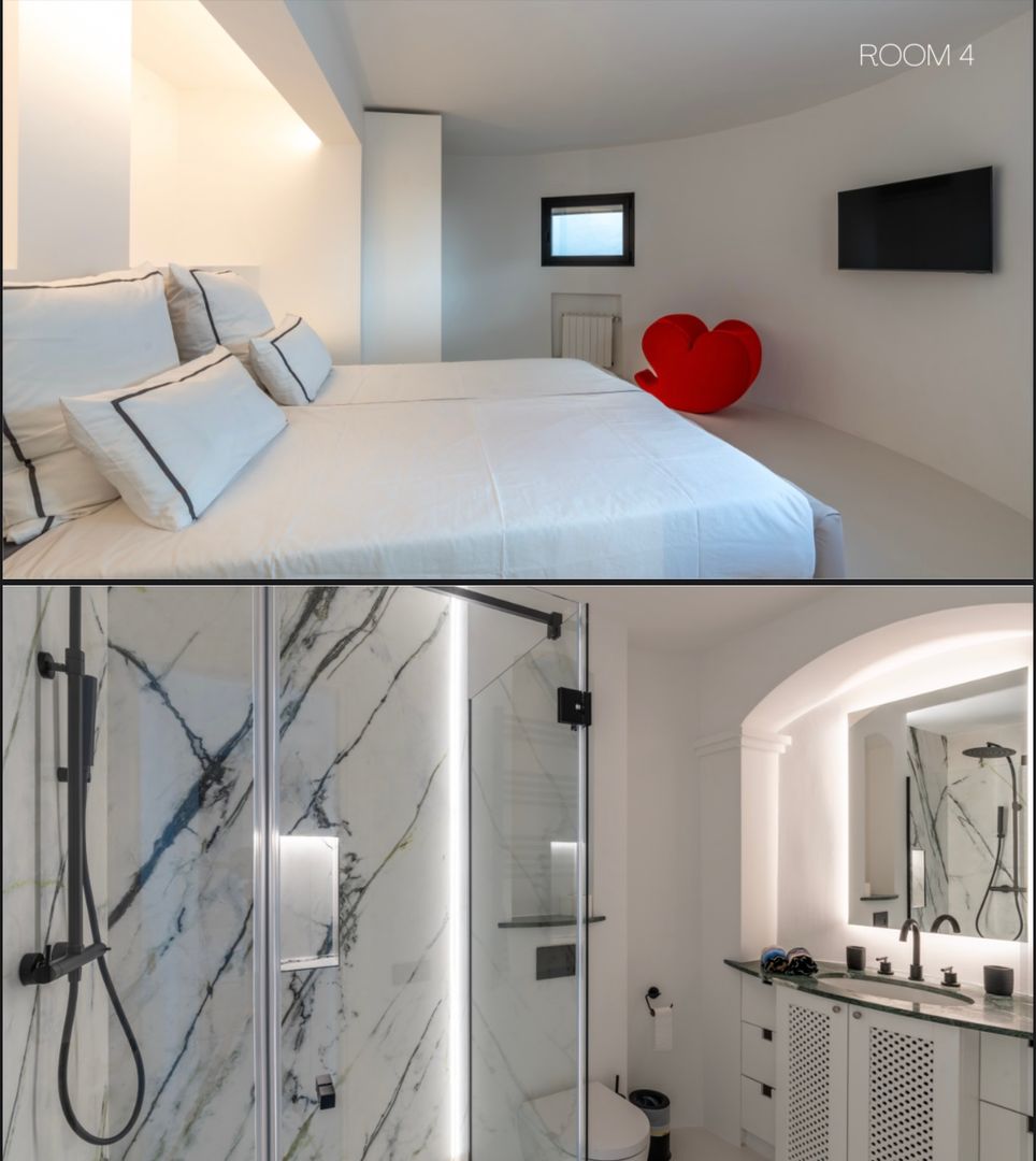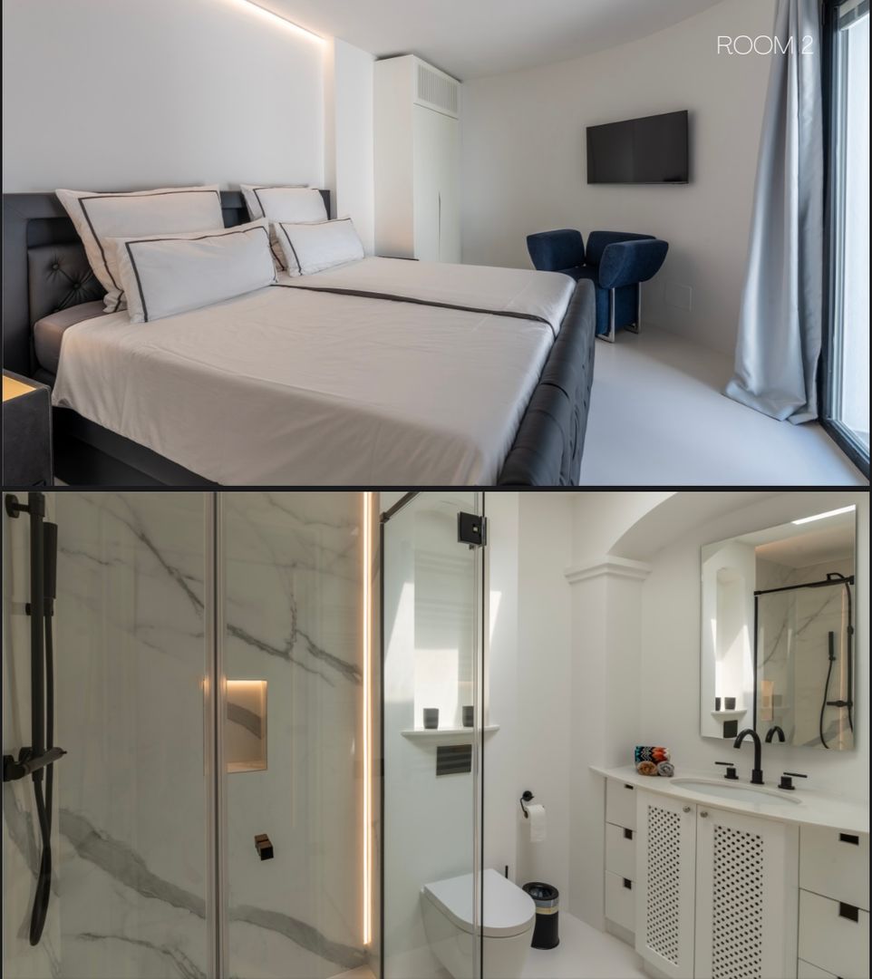 The main house features five bedrooms, each meticulously crafted to provide a luxurious retreat. For those seeking additional privacy, two expansive suites sit beneath the terrace. These ~90 square meter spaces, each with a bedroom, en-suite bathroom, and a small cinema corner, offer splendid views of Ibiza Town.