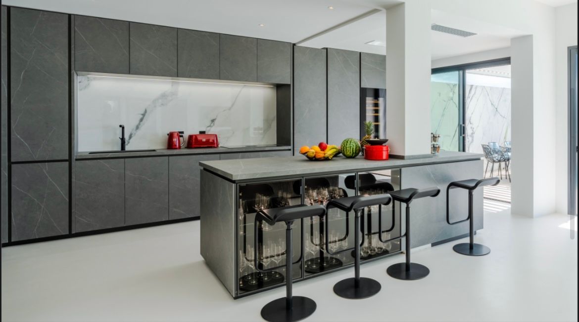 Awash with modern style, the villa is designed to provide panoramic views of the stunning Ibiza Town and Formentera Island. The heart of the house, an open plan kitchen and living room, leads directly to the terrace, offering sweeping vistas from every corner.